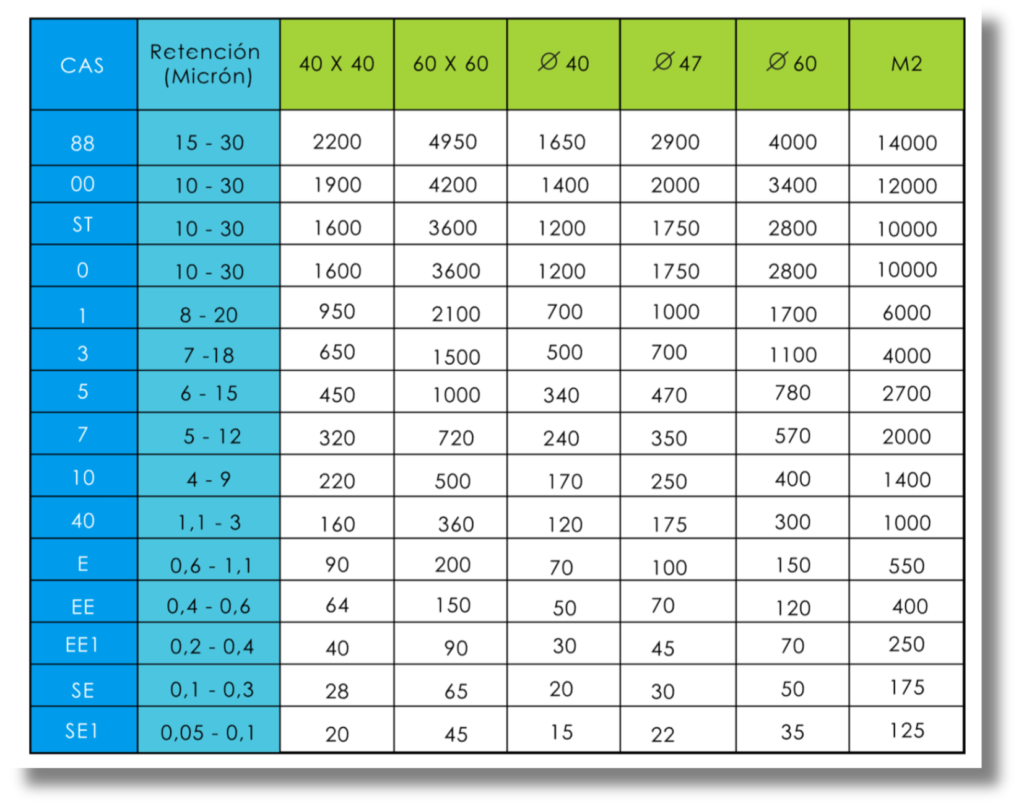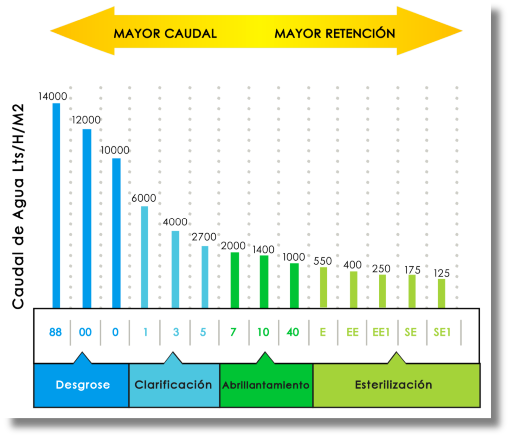Para agua expresado en litros por hora según el tamaño y forma de los filtros.